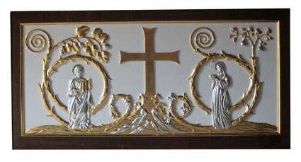 Postpendium pour l'autel de Chambourcy (78) représentant l'arbre de vie avec saint Barthélemy et sainte Clotilde.