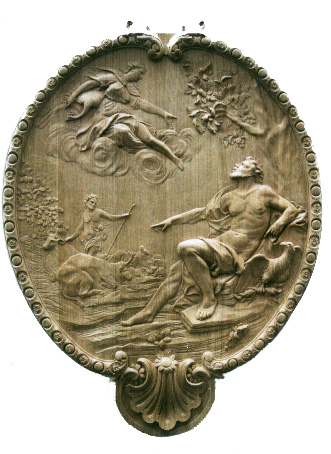Ce panneau a été réalisé pour le concours d'un des Meilleurs Ouvriers de France, et a été primé médaille d'or pour la session de 2004. Il représente les amours de Jupiter avec Io transformée par lui en génisse pour la soustraire de la jalousie d'Héra, son épouse. Ce médaillon est la copie fidèle d'un élément de boiserie d'époque Louis XV, au musée Soubise à Paris. |